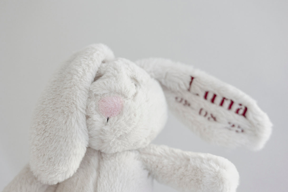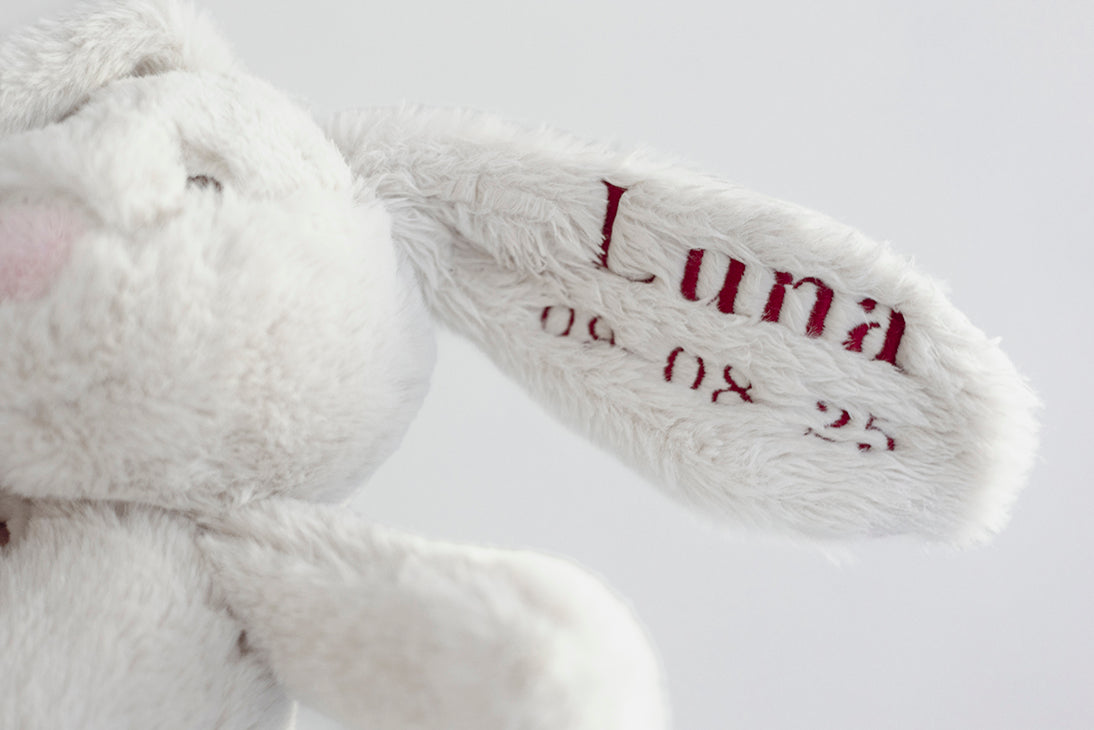 Dit schattige knuffelkonijn wordt extra bijzonder wanneer je hem laat personaliseren met de naam en/of geboortedatum van je kindje. Perfect als uniek (kraam)cadeau en een mooie herinnering voor later.