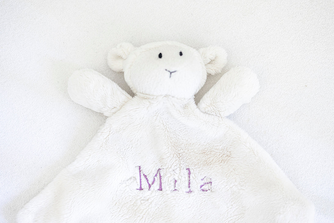 Schaapje knuffeldoekje – gepersonaliseerd met naam